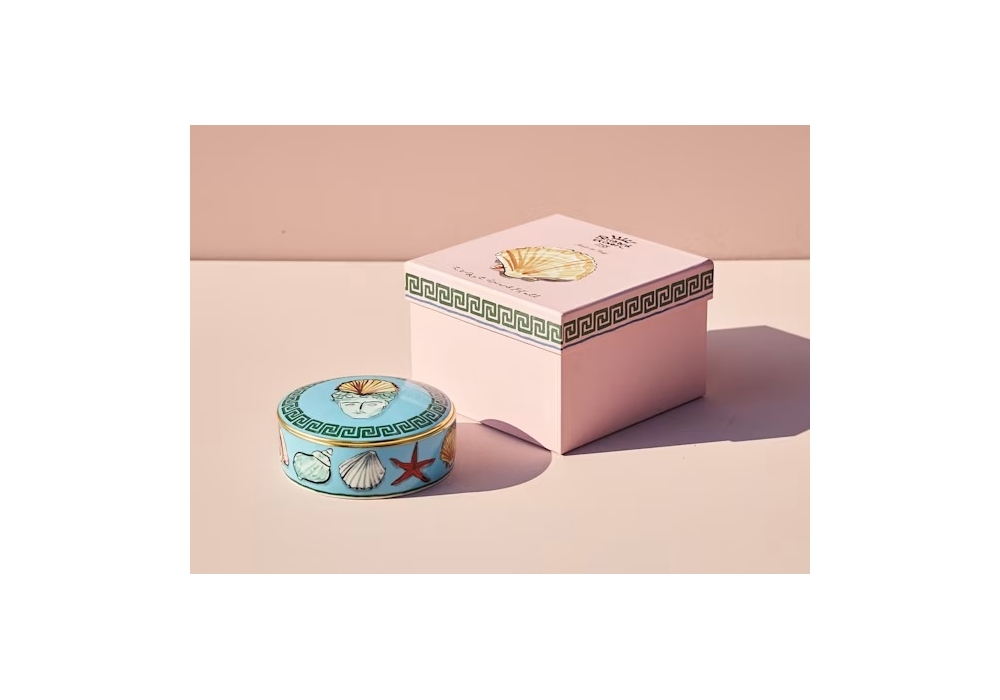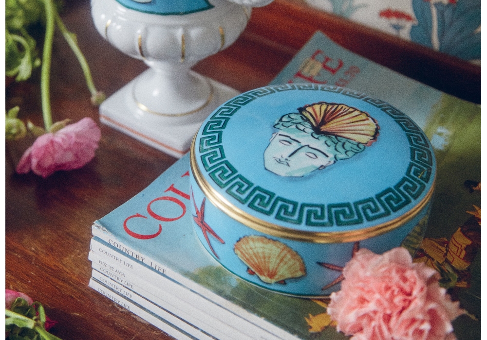 Scatola Talco Il Viaggio di Nettuno Sea Blue conçue par Luke Edward Hall pour Ginori 1735 est une boîte ronde décorée avec couvercle.