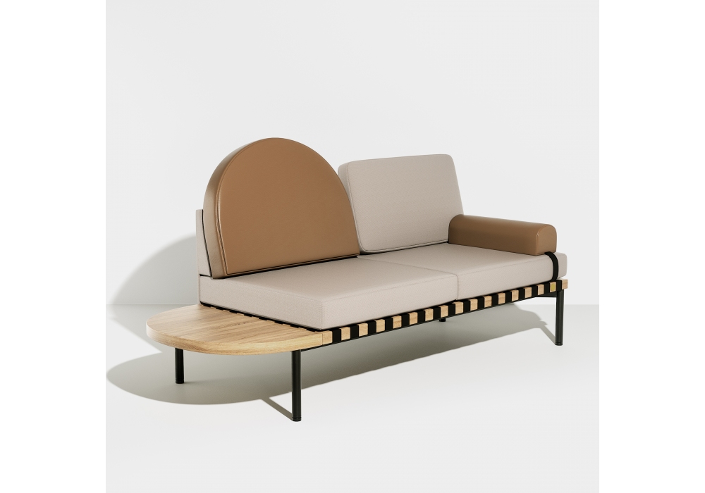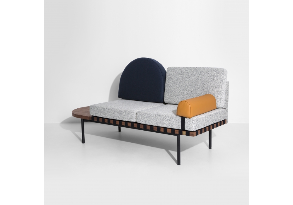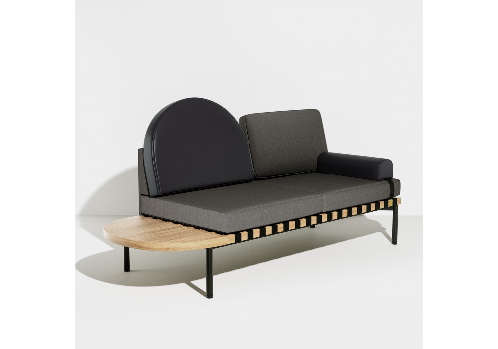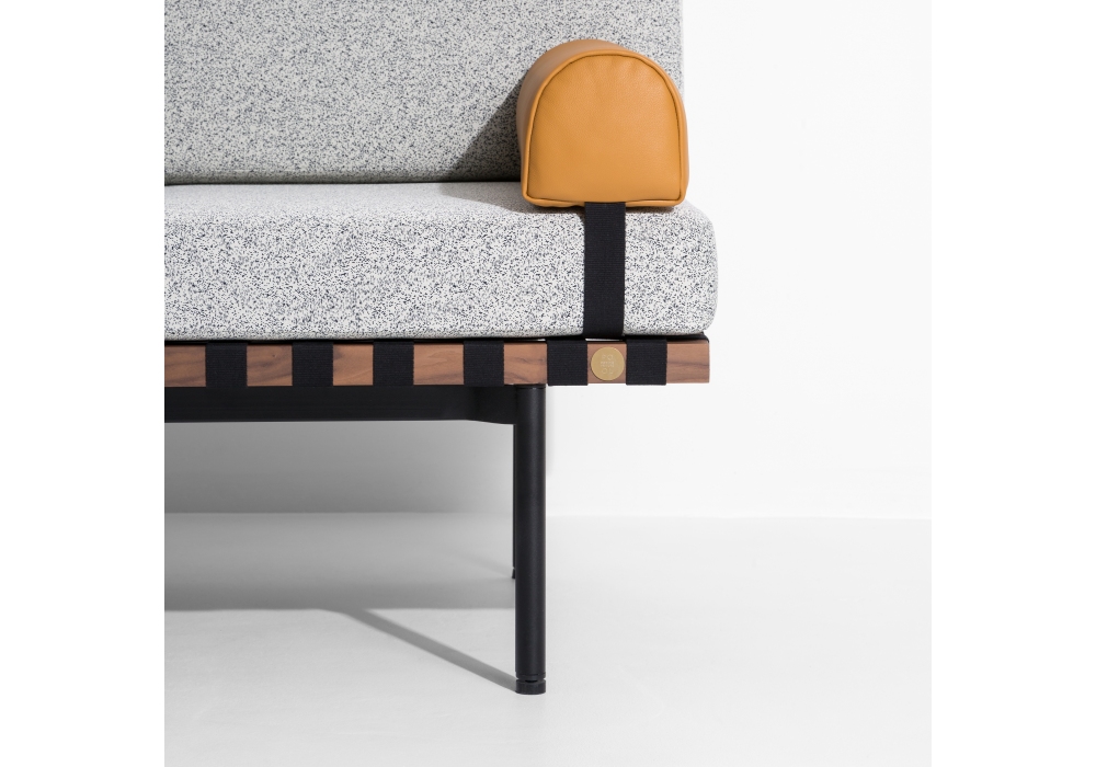 Grid conçu par Pool pour Petite Friture est un daybed réalisé avec une structure en bois, une base en acier et un revêtement en différents types de tissus. Coussin rond recouvert de tissu ou de cuir.