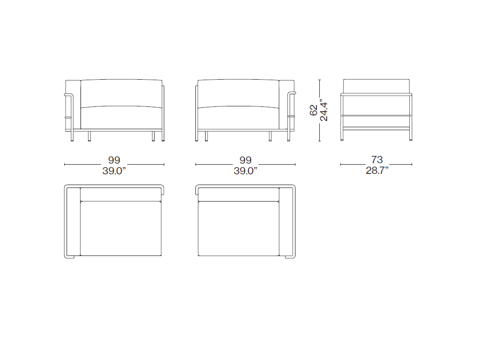 3 Fauteuil Grand Confort, Méridienne conçue par Le Corbusier, Pierre Jeanneret, Charlotte Perriand pour Cassina est une méridienne réalisée avec des coussins avec rembourrage en ouate de polyester ou en plumes. Rembourrage en tissu ou cuir en différentes finitions. Disponible avec accoudoir droit ou gauche.
