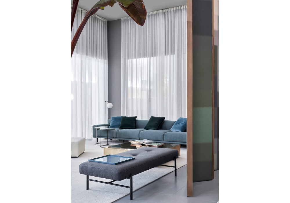 Nina conçu par Andrea Parisio pour Meridiani est un day bed rembourré avec structure tubulaire en métal vernie mat black. Revêtement disponible en tissu ou cuir.