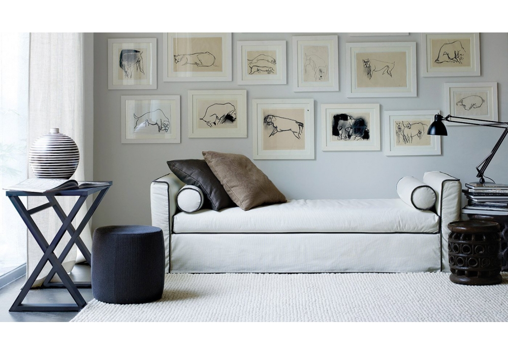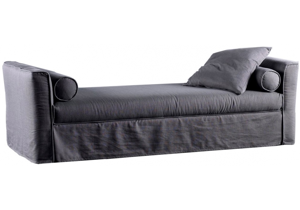 Law conçue par Andrea Parisio pour Meridiani est une dormeuse rembourrée avec passepoil en tissu. Structure en métal avec sommier à lattes et panneaux en bois rembourré en polyuréthane. Revêtement disponible en tissu.