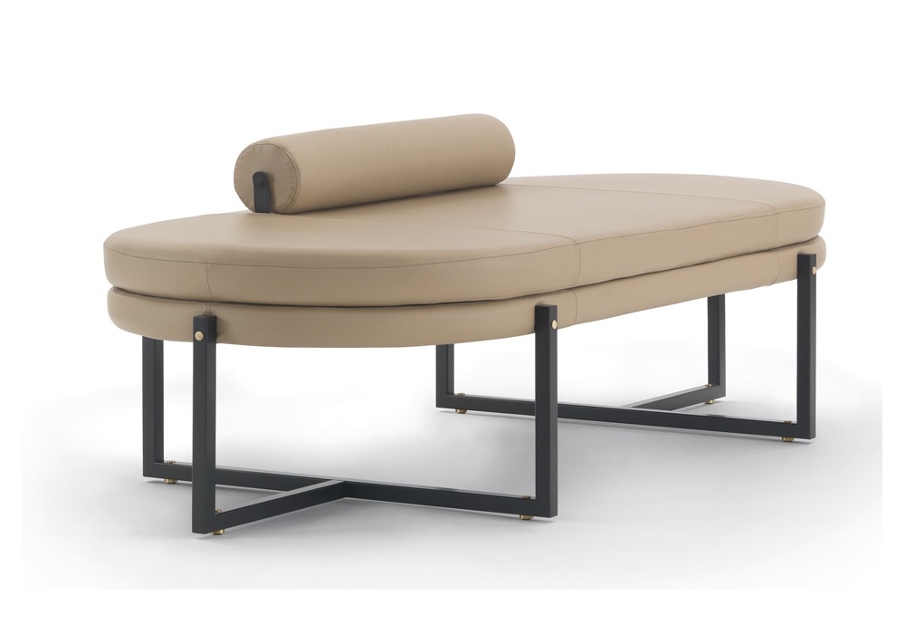 Sigmund conçue par Studio Asai pour Arflex est une dormeuse avec structure en métal, coussin et assise en polyuréthane. Base en métal laqué noir, vis en laiton satiné et pieds en laiton satiné avec caoutchouc noir. Revêtement en tissu amovible ou en cuir non amovible. Coussin à roulettes en option.