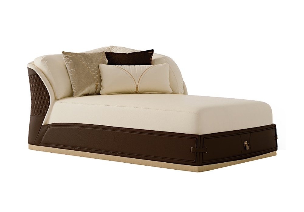 Vogue conçue par Andrea Bonini pour Turri est une dormeuse avec structure en bois massif et contreplaqué rembourrée en mousse de polyuréthane multi-densité. Coque en cuir brodé hexagone et coussins en différents cuirs ou tissus. Base et détails décoratifs en métal doré. Disponible en version droite ou gauche.
