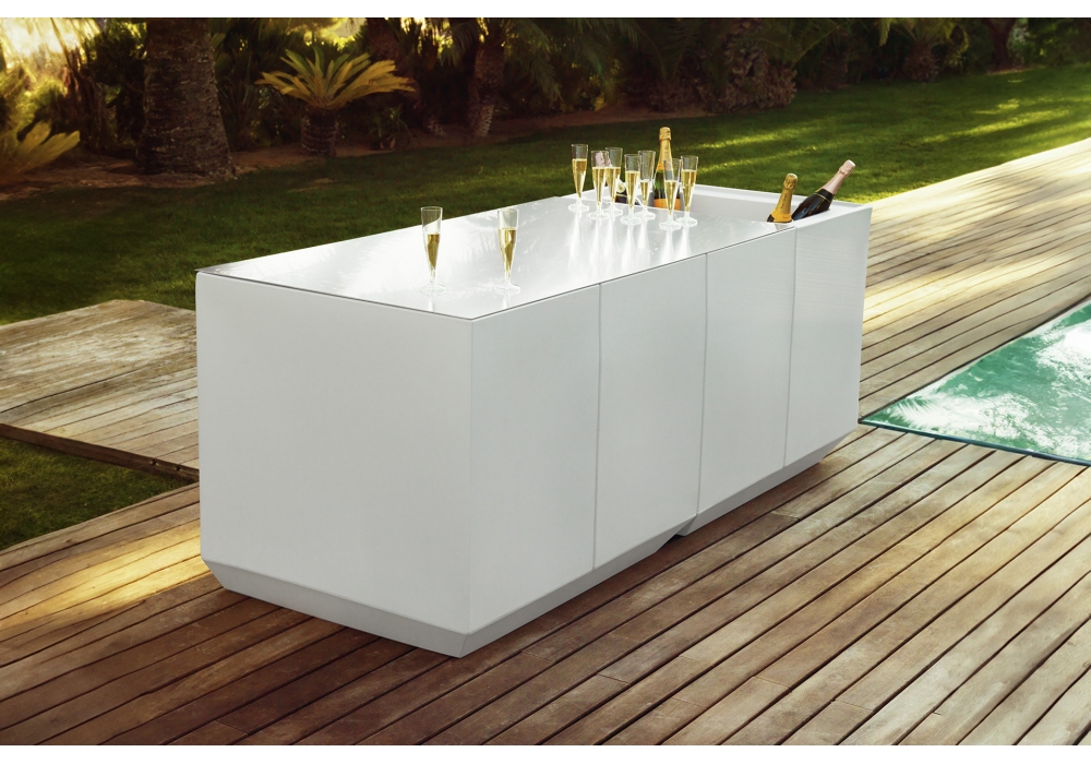 Vela conçu par Ramón Esteve pour Vondom est un comptoir de bar en résine de polyéthylène avec une finition mate ou laquée ou avec un éclairage LED interne. Disponible en différentes finitions et compositions.