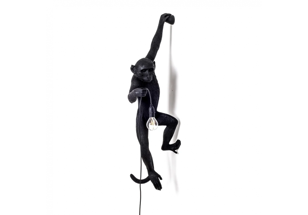 La Lampe Gauche Monkey conçue par Marcantonio Raimondi Malerba pour Seletti est une applique réalisée en résine noire soutenue par un ancrage mural spécial. La source lumineuse adoptée est une LED à filament alimentée par un câble en plastique.