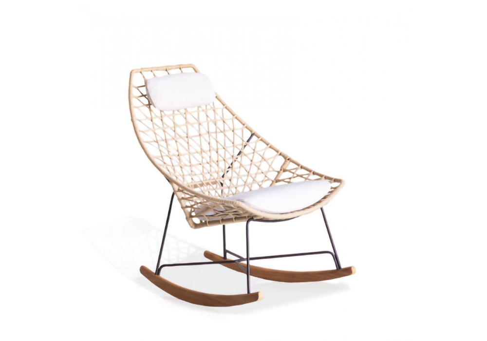 Cut Outdoor conçue par Stephan Veit pour Potocco est une chaise à bascule d'extérieur avec structure tubulaire en métal peint en différentes finitions et patins en bois d'iroko. Le corps est recouvert d'une corde à gaz beige. Les coussins d'assise et l'appui-tête sont en mousse de polyuréthane recouverte d'un tissu adapté à une utilisation en extérieur. Cut Outdoor est disponible en différentes finitions.
