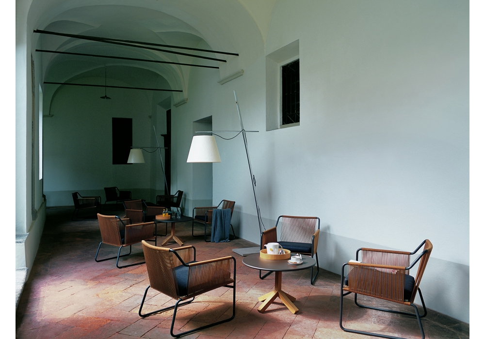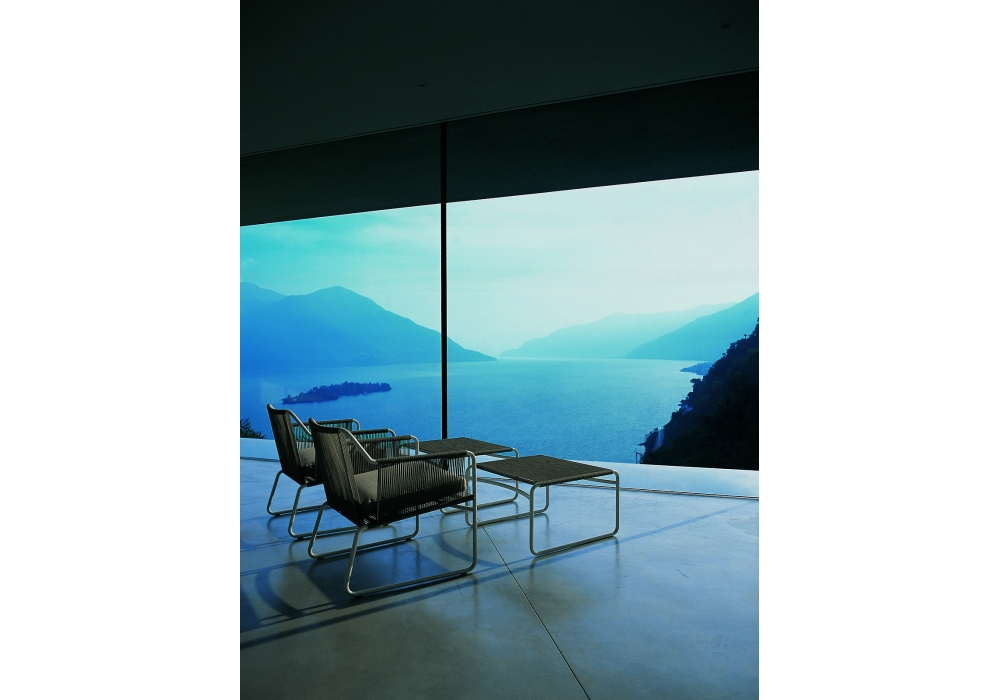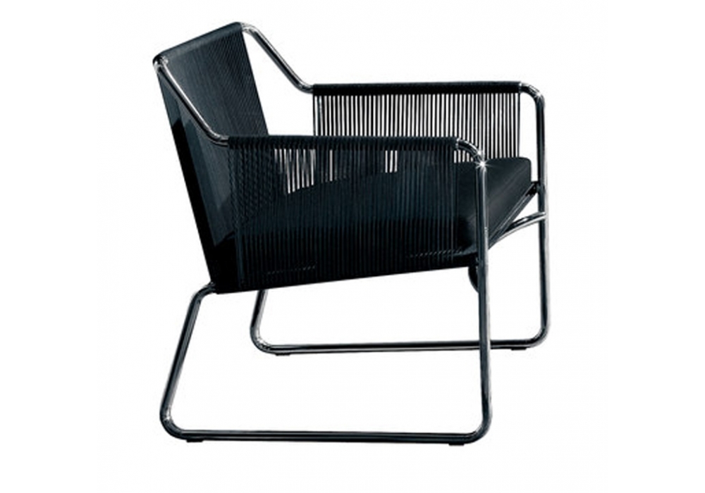 Harp 368 is an outdoor lounge chair with cushion designed by Rodolfo Dordoni for Roda. The classic string chair finds a new outdoor dimension, where polyester trails its infinite filaments around a tubular stainless steel structure in one continuous outline. Neutrality is ignited by seat cushions of different colors; lightness is given by air vibrating through the cords. Harp is a celebration of a craft manufacturing: a never-ending weave of cords that twine the stainless steel frame drawing lines that look continuous to the human eye. The structure, made in painted stainless steel welded by hand, and the cords, in a double polyester twisted thread with a cotton finishing, is available in milk/sand, smoke/grey, carob/tobacco, smokeolive, milkolive.