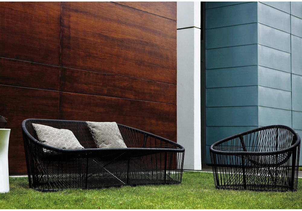 1009 Club conçu par Prospero Rasulo pour Zanotta est un petit fauteuil avec structure interne en acier verni pour extérieurs. Tressage en fil de PVC avec renfort interne en nylon, couleur marron.