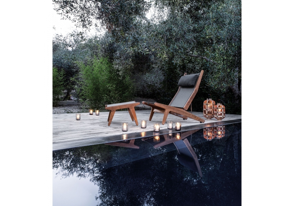 Bay conçue par Henrik Pedersen pour Gloster est une chaise inclinable d'extérieur en teck poli avec assise et dossier en bandoulière. Coussin d'appui-tête en tissu inclus.