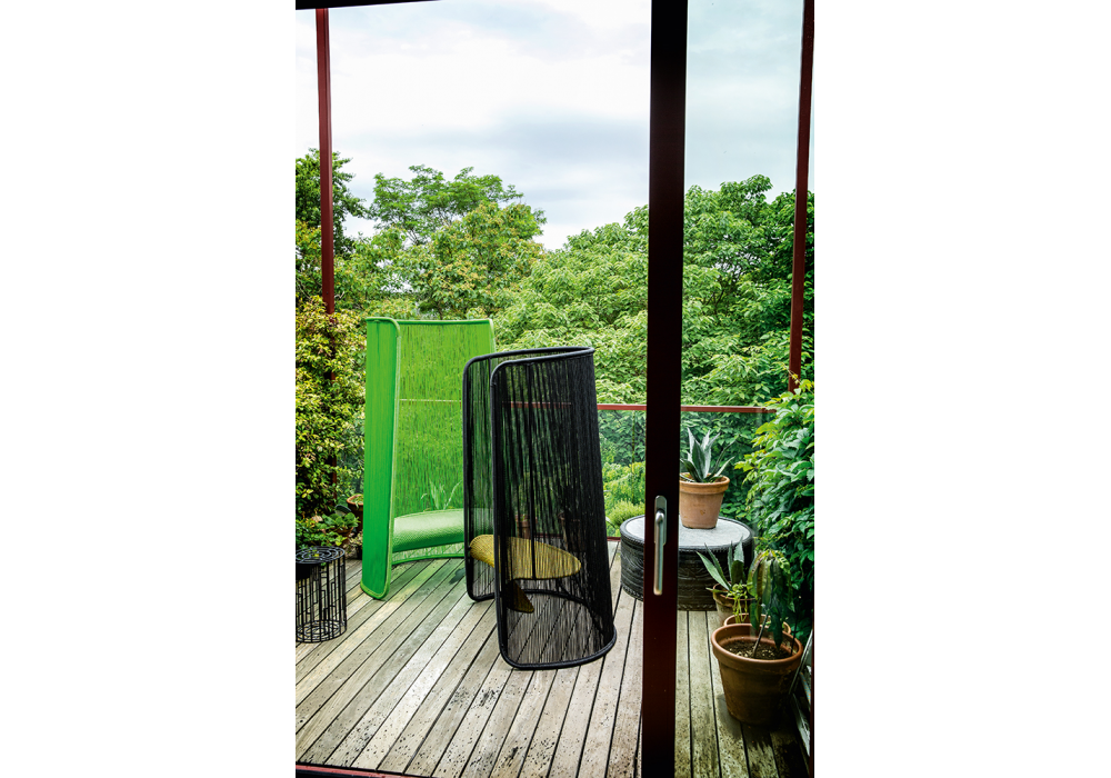 Husk conçu par Marc Thorpe pour Moroso est un fauteuil avec structure en acier peint et fils de polyéthylène colorés tissés à la main. Semelles intérieures réglables en polypropylène.