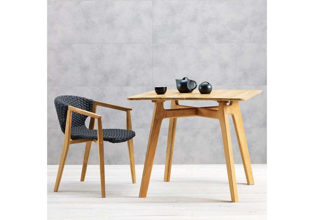Knit conçu par Patrick Norguet pour Ethimo est un fauteuil avec structure en bois de teck en différentes finitions et revêtements.