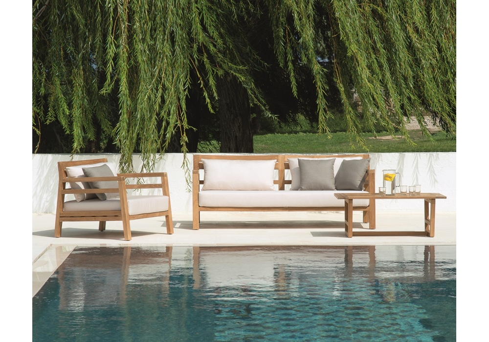 Costes conçu par Ethimo est un fauteuil avec structure en bois de teck en différentes finitions et revêtements.