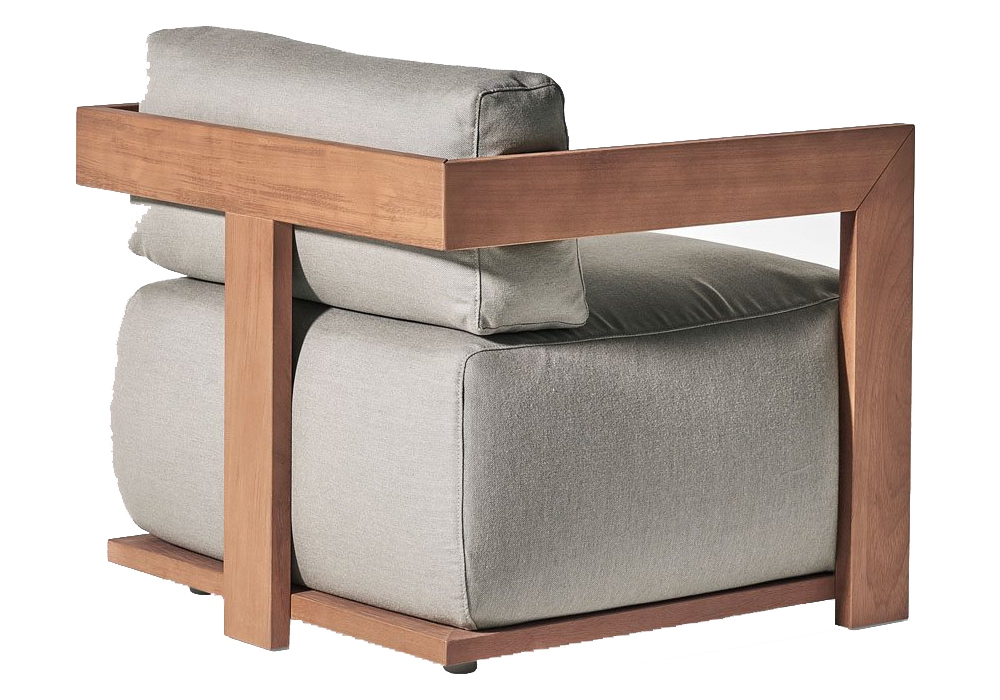 Claud Open Air conçu par Andrea Parisio pour Meridiani est un fauteuil pour l'extérieur. Structure en bois d’iroko blanchi et coussin en polyuréthane et fibre polyester.