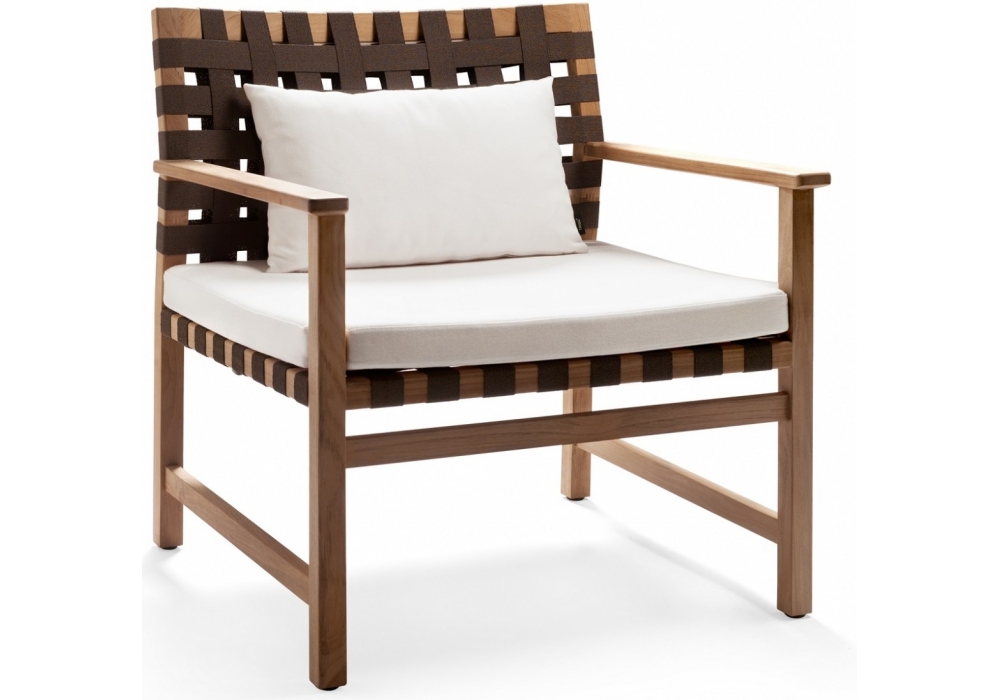Vis à Vis conçu par Piergiorgio Cazzaniga pour Tribù est un fauteuil avec structure en teck et assise et dossier en tissu Canax, résistant aux intempéries. Le coussin de siège est rembourré et recouvert de différents tissus et couleurs. Il est possible d'ajouter un coussin lombaire, ce qui rend l'assise encore plus confortable.