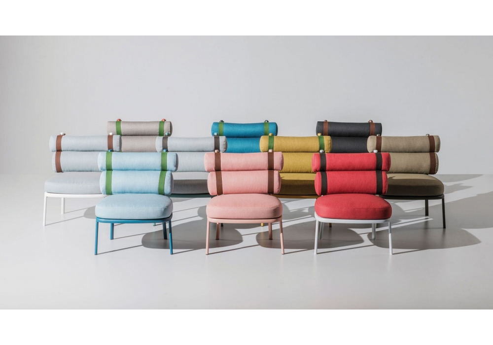 Roll conçu par Patricia Urquiola pour Kettal est un fauteuil club avec une structure en aluminium peint. Les coussins d'assise et de dossier sont rembourrés et recouverts de tissu, le dossier étant ancré par des sangles en tissu. Roll est disponible dans différentes finitions de structure et de revêtement.