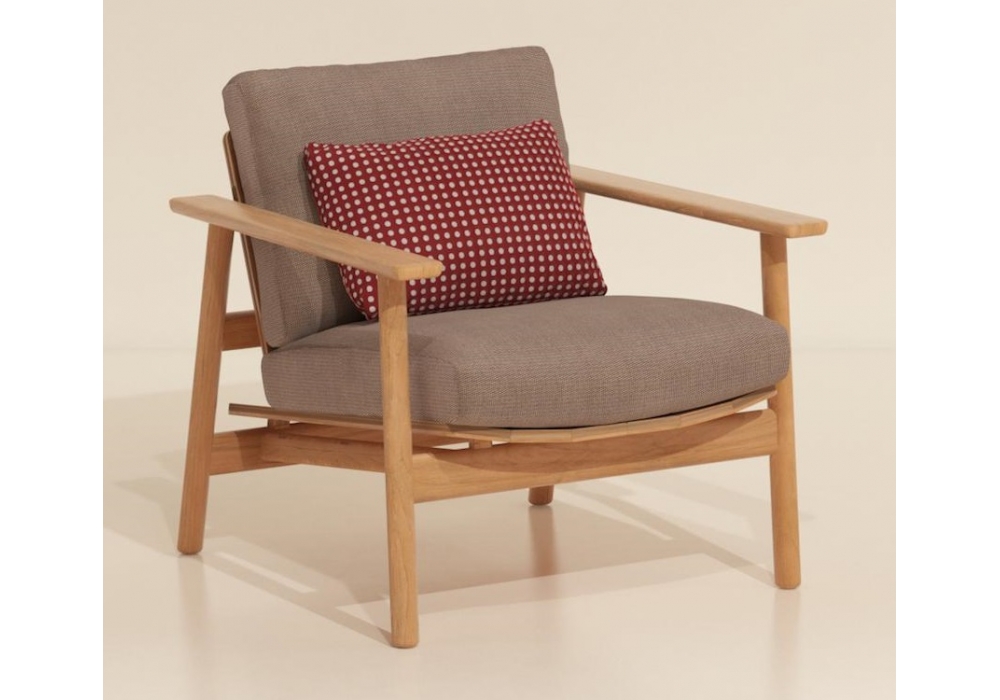 Riva conçu par Jasper Morrison pour Kettal est un fauteuil avec une structure entièrement réalisée en bois de teck. Les coussins d'assise et de dossier sont rembourrés et revêtus de tissu disponible en différentes finitions.