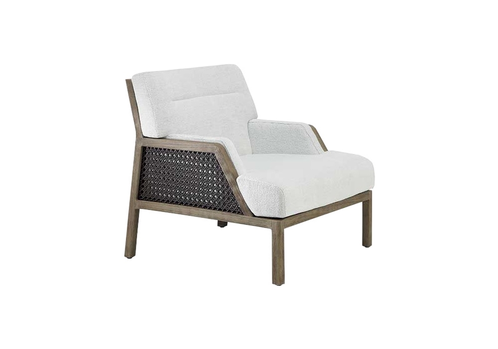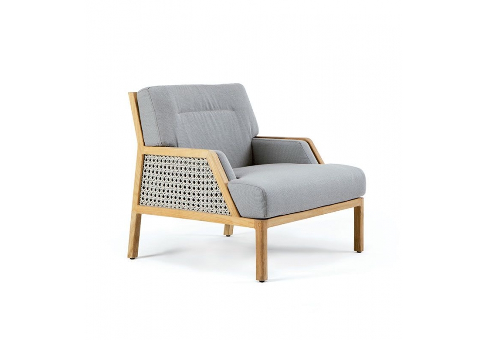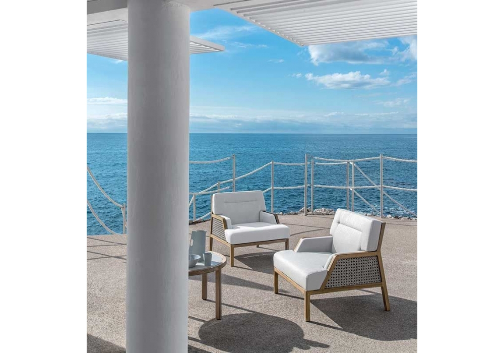 Grand Life conçu par Christophe Pillet pour Ethimo est une bergère avec structure en teck et corde tressée. Le coussin d'assise et de dossier est recouvert de tissu acrylique ou de corde. Grand Life est disponible en différentes finitions et revêtements.