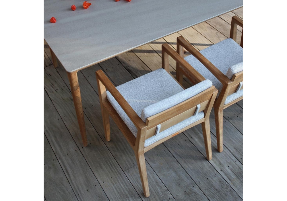 Zenhit conçu par Kris Van Puyvelde pour Royal Botania est un petit fauteuil réalisé en teck. Coussins d'assise et de dossier disponibles en différents tissus.