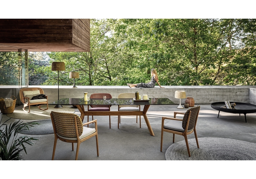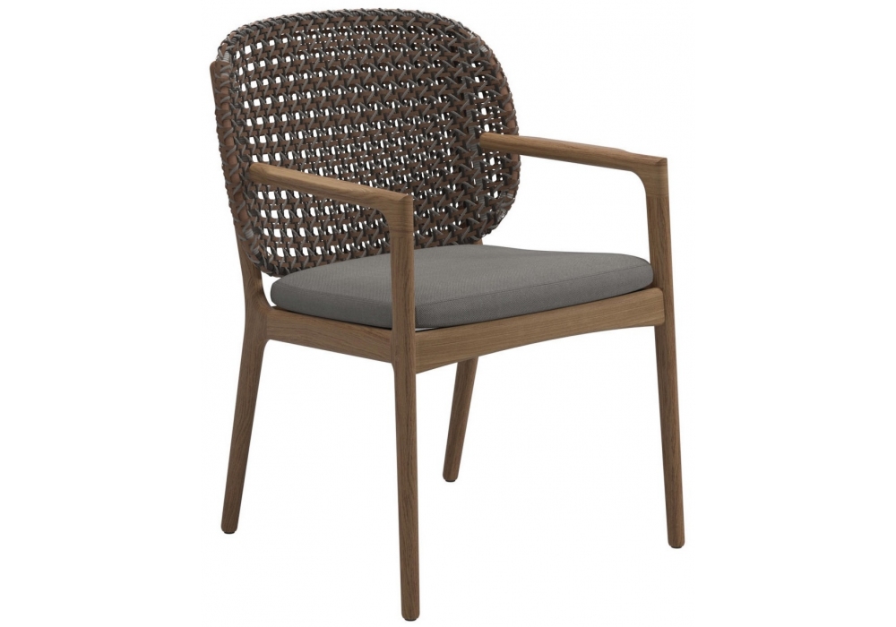 Kay conçu par Henrik Pedersen pour Gloster est un fauteuil salle à manger avec structure en teck et dossier en osier tressé. Coussin d'assise en tissu extérieur inclus.