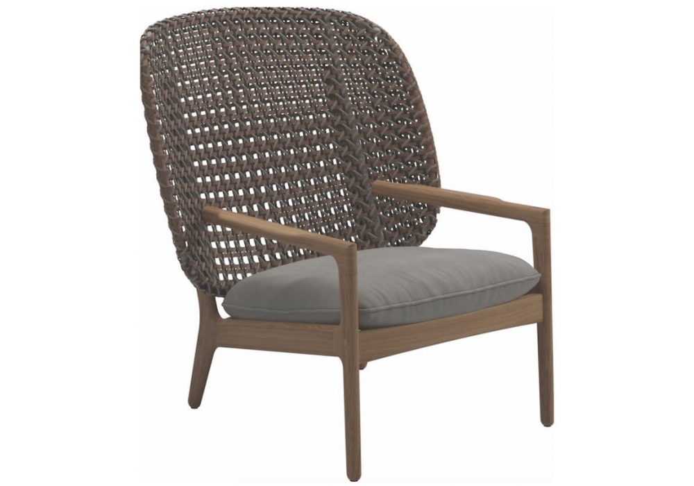 Kay conçu par Henrik Pedersen pour Gloster est un fauteuil lounge avec structure en teck et dossier en osier tressé. Coussin d'assise en tissu extérieur inclus. Disponible en 2 dimensions: avec dossier bas ou haut.