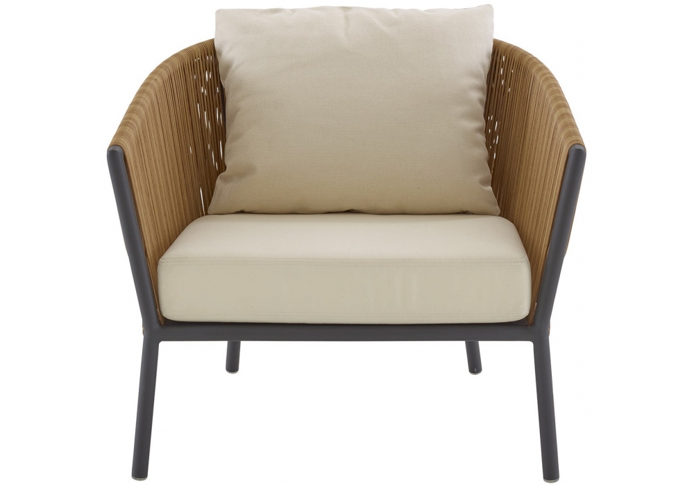 Lapel conçu par Busetti Garuti Redaelli pour Ligne Roset est un fauteuil d'extérieur avec structure en aluminium laqué charbon, dossier en rotin synthétique tressé et rembourrage d'assise en mousse de polyuréthane recouvert en tissu beige 100% polyester. Coussin de dossier (65 cm x 55 cm) rembourré en 100% polyester.