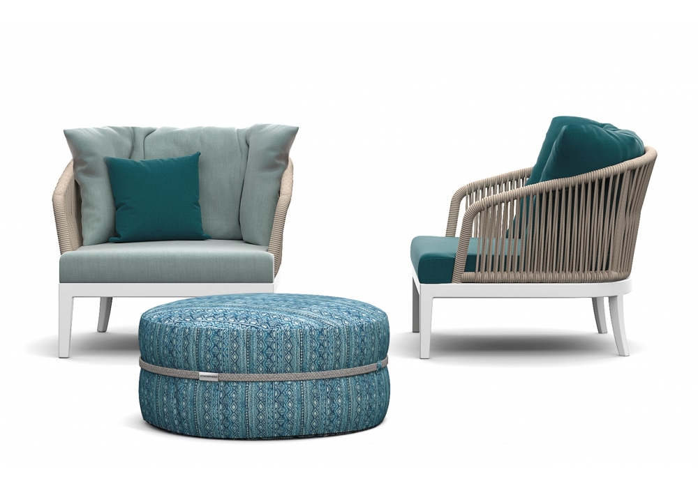 Dream 2.0 conçu par Atmosphera est un fauteuil d'extérieur en aluminium et structure en corde. Revêtement des coussins de dossier et d'assise en tissu. Sur demande, il est possible d'ajouter des coussins décoratifs de différentes dimensions.