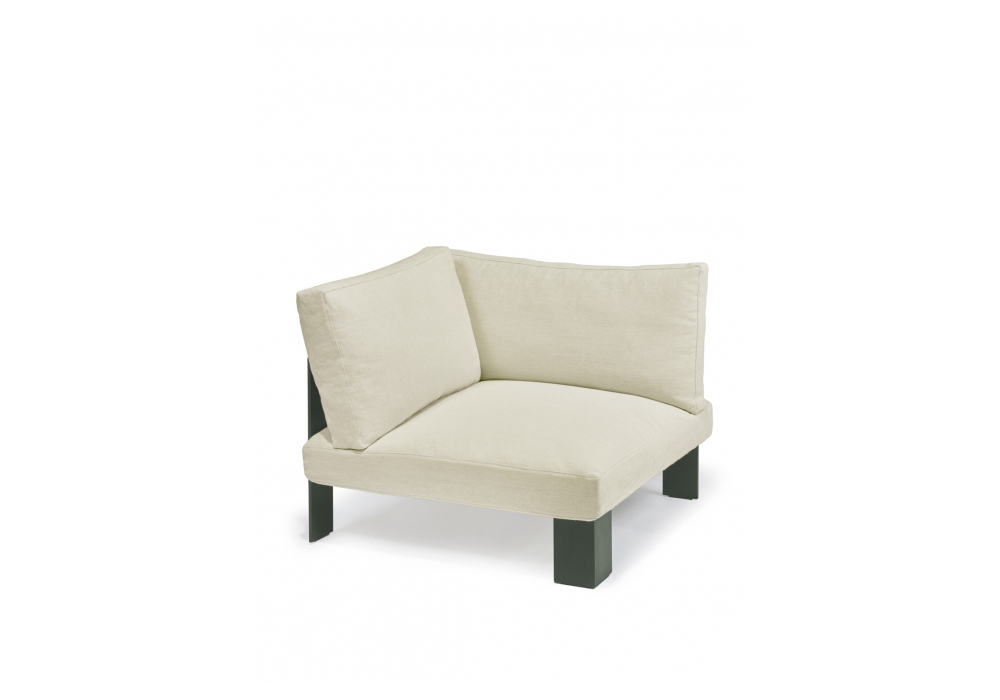 Bench Corner conçu par Bea Mombaers pour Serax est un fauteuil d'angle d'extérieur, avec structure de support composée de petits carrés en aluminium peint en noir. Le rembourrage est disponible en différentes finitions.