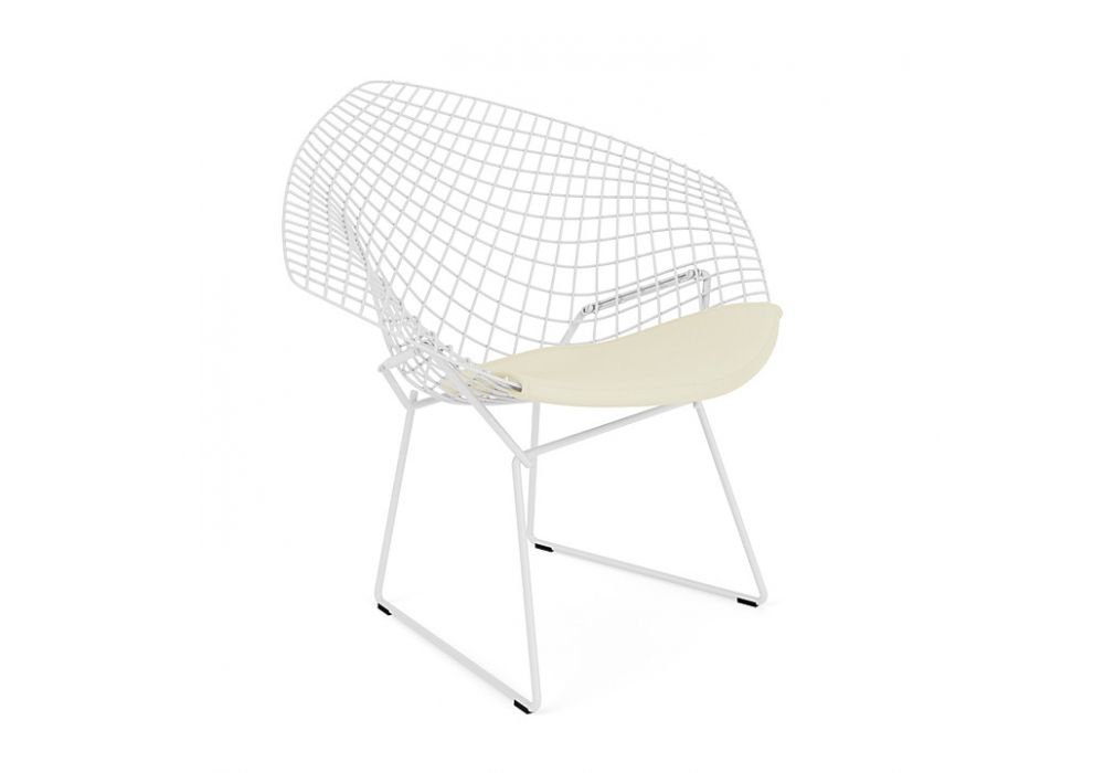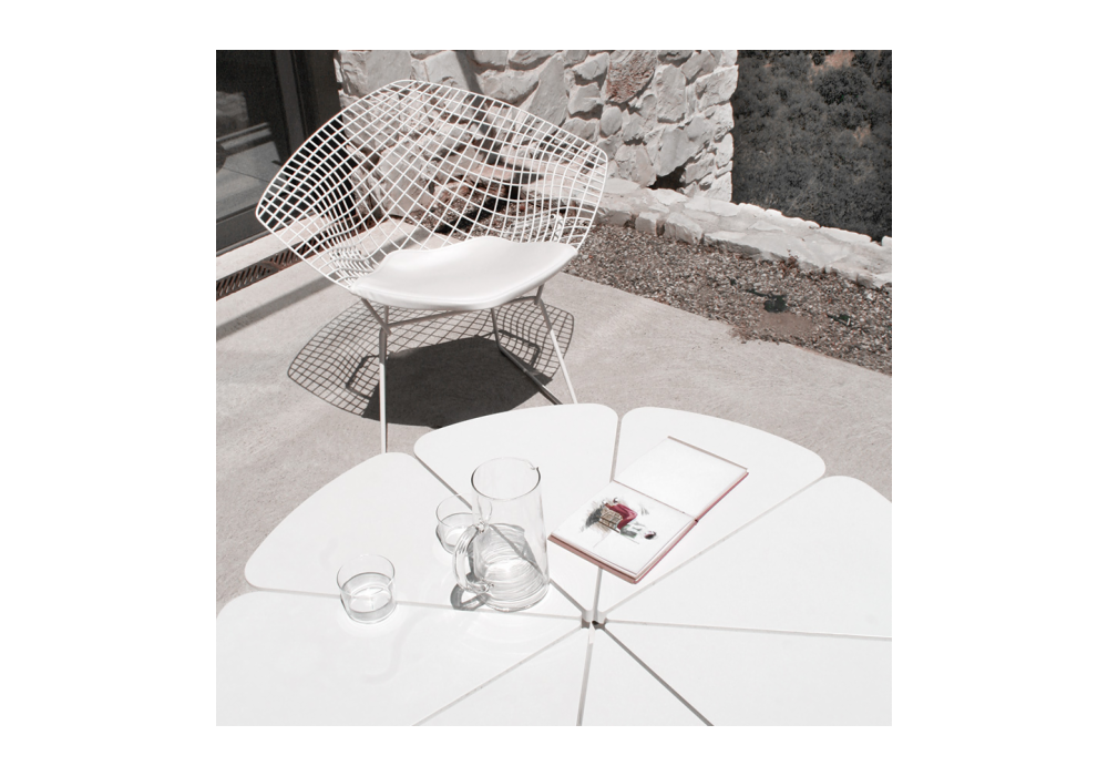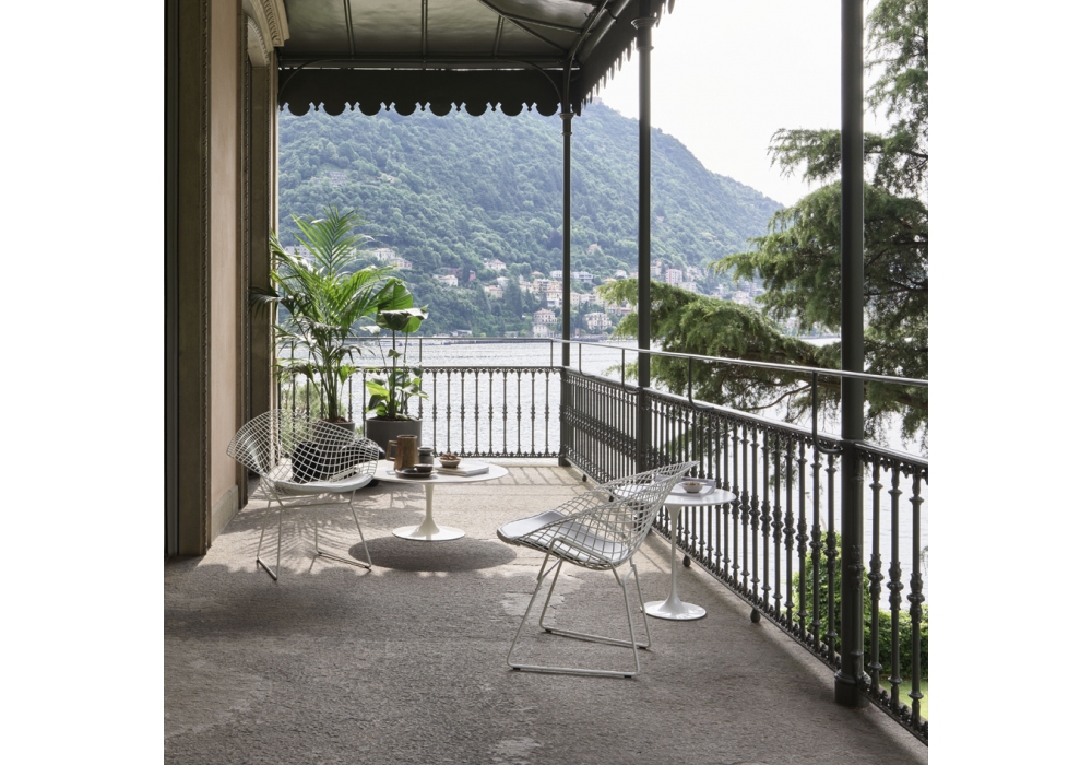 Bertoia Diamond Outdoor conçue par Harry Bertoia pour Knoll est une petite fauteuil avec coussin en vinyle disponible en différentes finitions. Structure en acier inoxydable avec finition protectrice Rilsan.