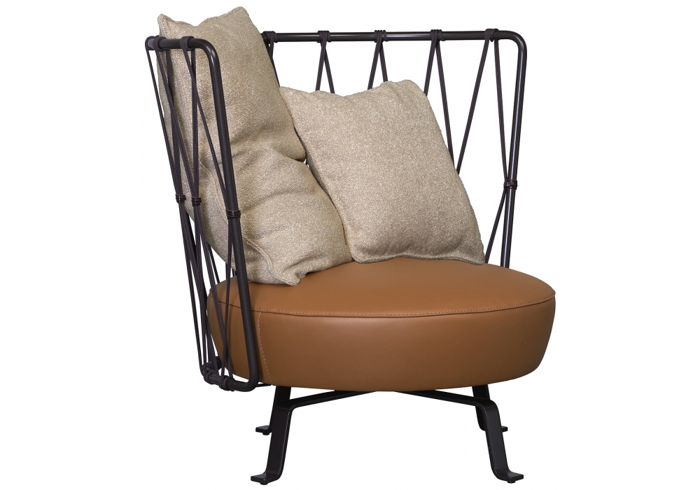 Pedro Outdoor conçu par Roberto Lazzeroni pour Baxter est un fauteuil avec struvture en acier inoxydable 316 peint en poudre brun foncé. Assise en contreplaqué marin. Mousse de polyuréthane à densité unique pour l'extérieur. Ressort extérieur avec sangles élastiques tissées en caoutchouc enduit. Dossier avec tissage de corde polyester pré-étiré, diamètre 5 mm. Disponible en blue navy, ecrù et marron mat. Base tournante en acier inoxydable 316. Revêtement disponible uniquement en cuir d'extérieur ou en tissu.
