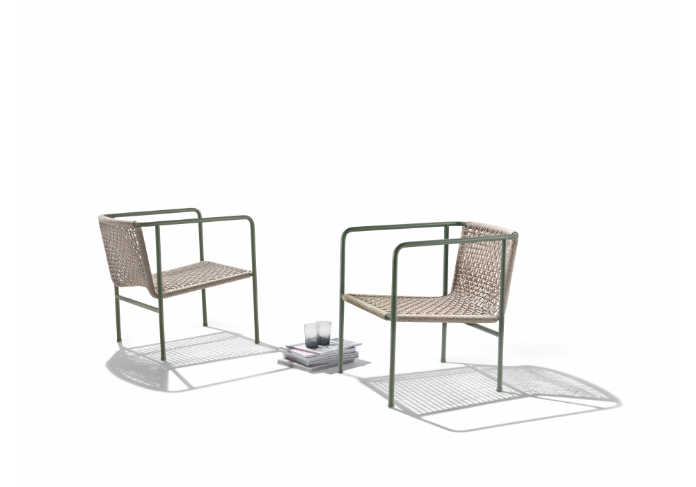 Ottavia conçu par Antonio Citterio pour Flexform est un fauteuil d'extérieur avec structure en acier inoxydable et coque en corde tissée à la main en PVC ou polypropylène.