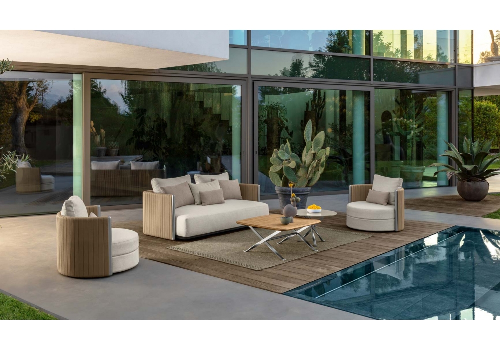 George conçu par Ludovica et Roberto Palomba pour Talenti est un fauteuil d'extérieur avec des sangles rembourrées tissées dans une structure en acier et des coussins rembourrés en tissu.