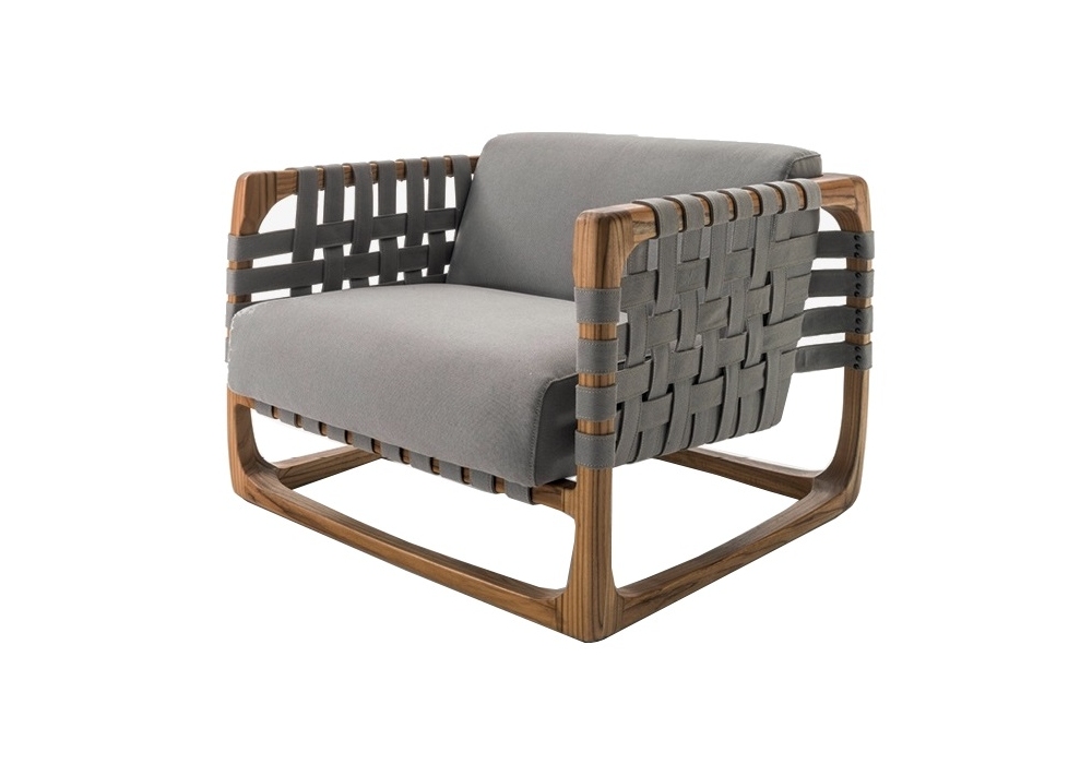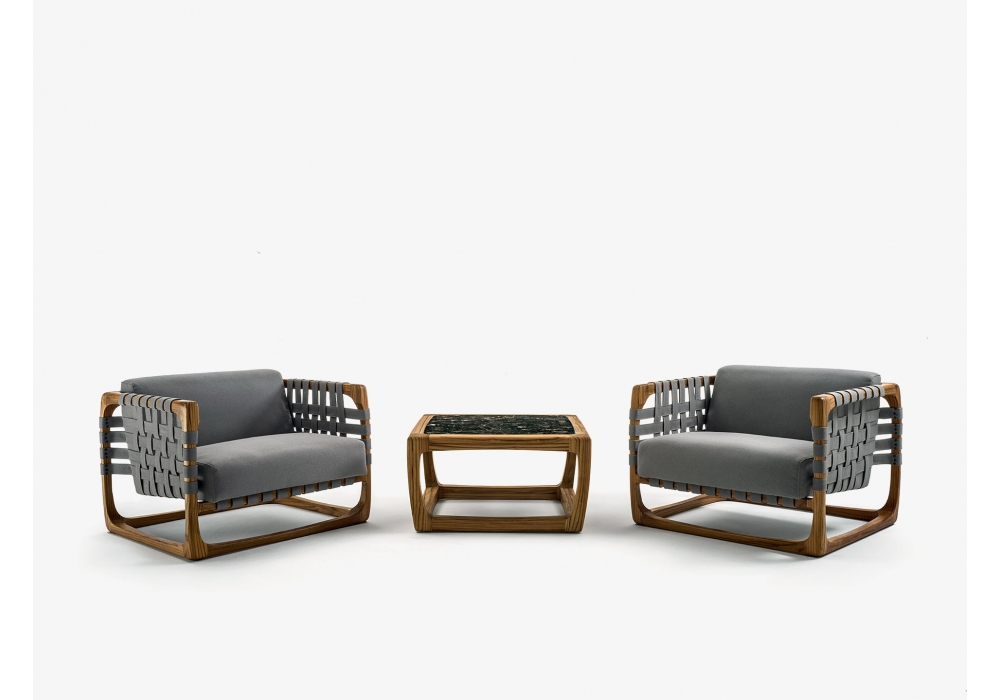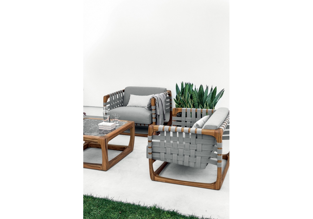 Bungalow Outdoor conçu par Jamie Durie pour Riva 1920 est un fauteuil rembourré avec structure en bois de teck massif entièrement tourné, assemblé et poncé à la main. Un entrelacement de cordes en tissu d'extérieur caractérise l'assise, le dossier et les accoudoirs.