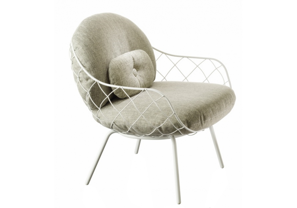 Piña conçu par Jaime Hayón pour Magis est un fauteuil adapté aussi à l'extérieur avec structure et coque en acier peint et coussin assise/dossier en mousse de polyuréthane recouvert de tissu en différentes finitions. Possibilité d'ajouter un coussin lombaire.
