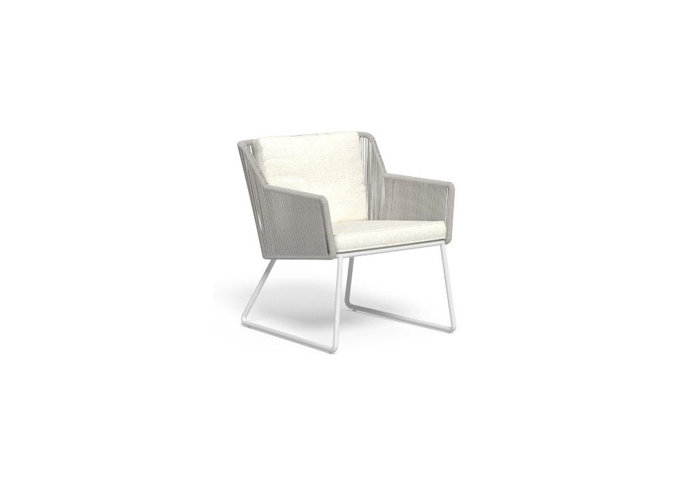 Coral conçu par Marco Acerbis pour Talenti est un fauteuil d'extérieur avec structure en aluminium. Dossier et accoudoirs recouverts d'un tressage en corde synthétique. Les coussins sont déhoussables et recouverts de tissus d'extérieur résistants aux intempéries.