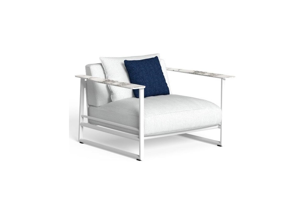 Riviera conçu par Jean Philippe Nuel pour Talenti est un fauteuil d'extérieur avec structure en aluminium thermolaqué, accoudoirs avec insert en grès. Les coussins sont déhoussables et recouverts de tissus d'extérieur résistants aux intempéries.