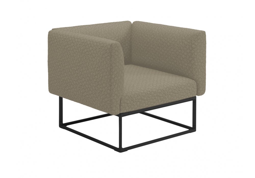 Maya conçue par Mark Gabbertas pour Gloster est une chaise longue d'extérieur composée d'une structure en aluminium enduit de poudre et de coussins d'assise, de dossier et d'accoudoirs rembourrés en tissu d'extérieur.