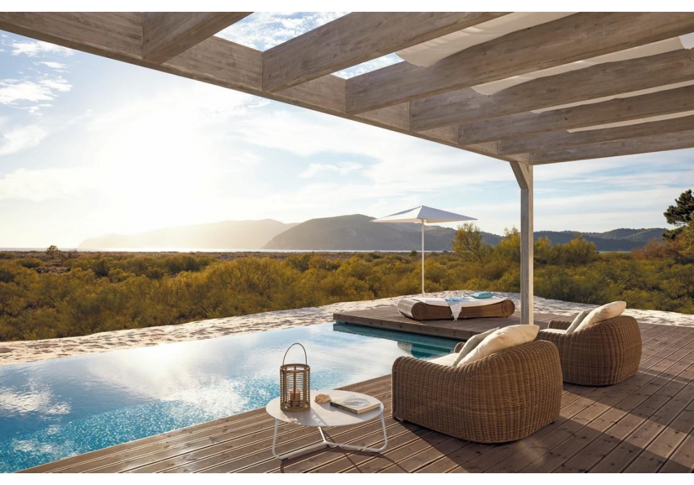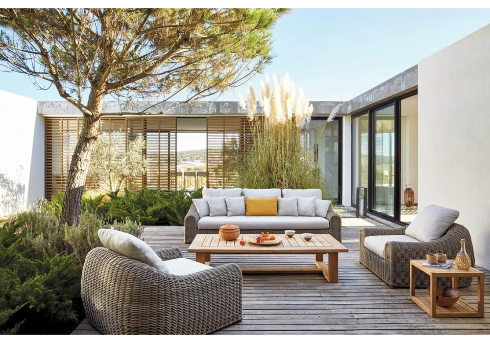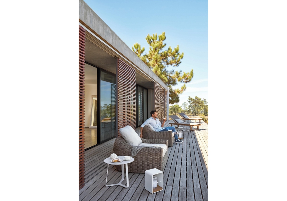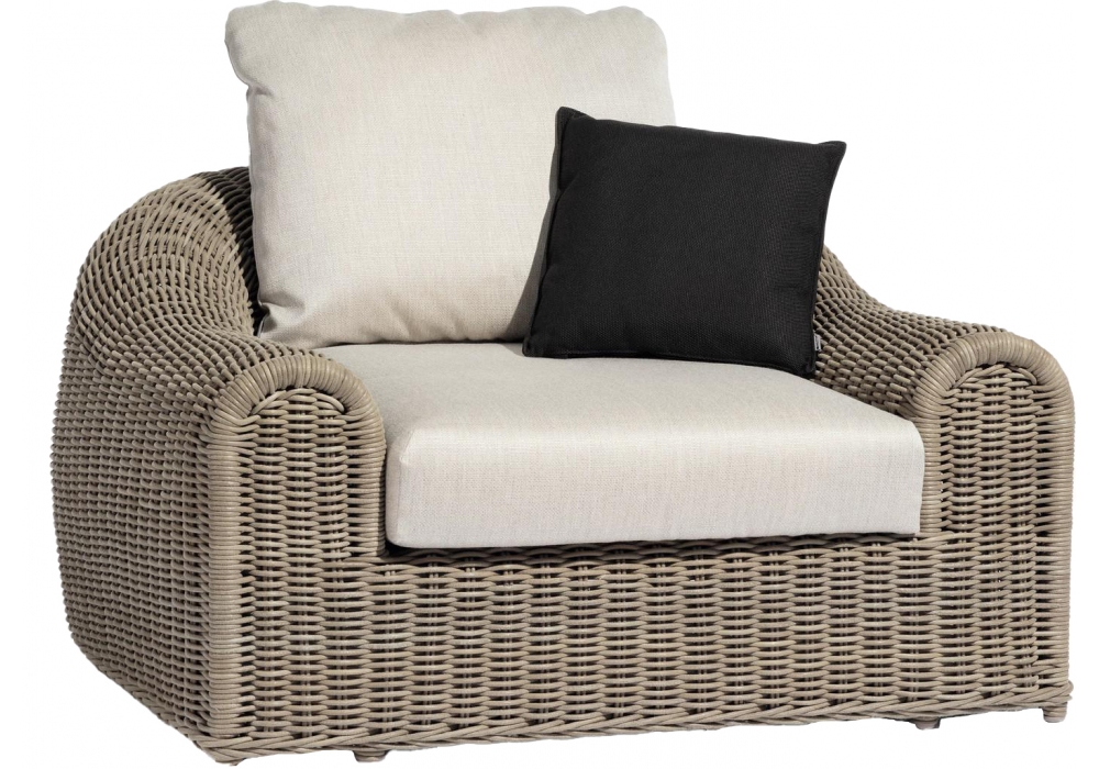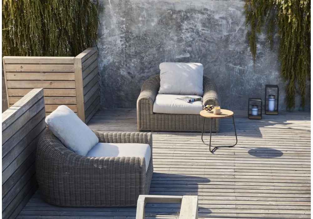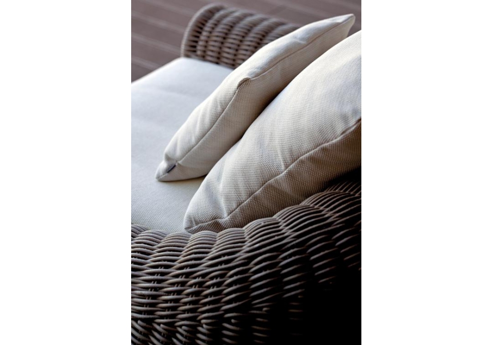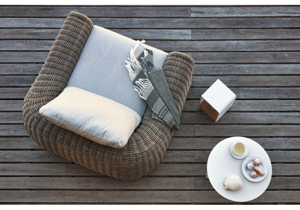 River conçu par Stephane De Winter pour Manutti est un fauteuil avec structure en osier et coussins avec revêtement disponible en différentes finitions.
