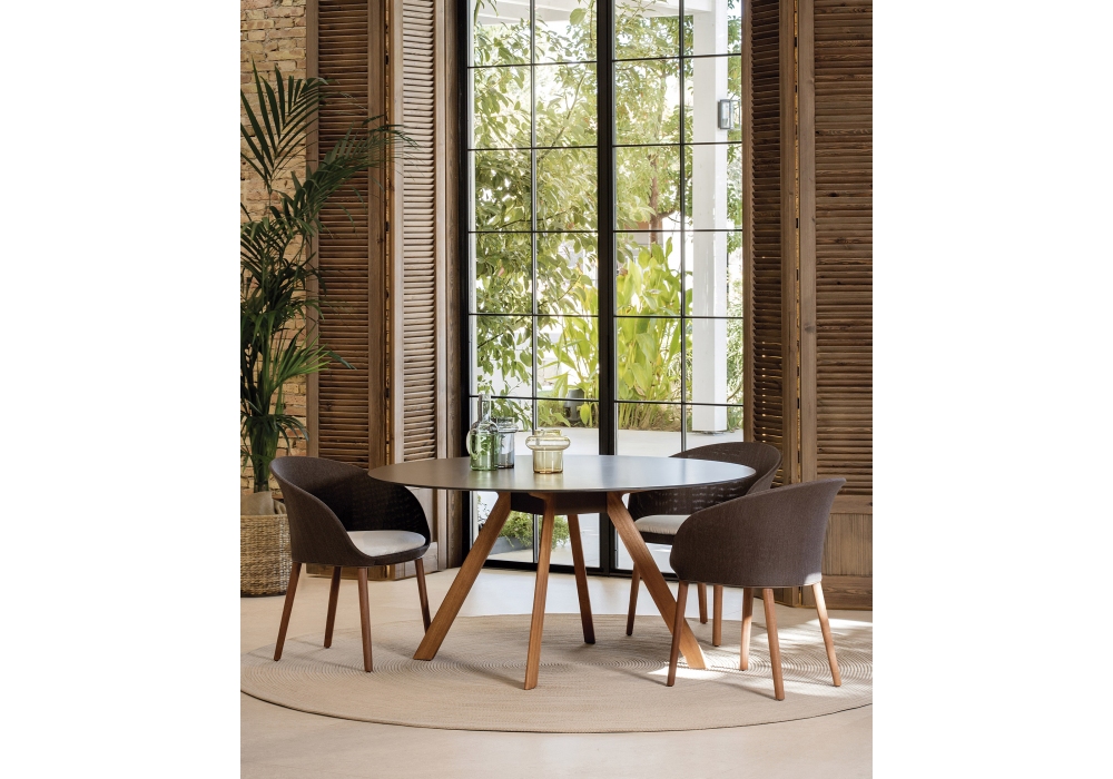 Blum Wood conçu par Manel Molina pour Expormim est un fauteuil d'extérieur avec structure en tube d'aluminium très résistant et pieds en bois. Disponible en différentes finitions.