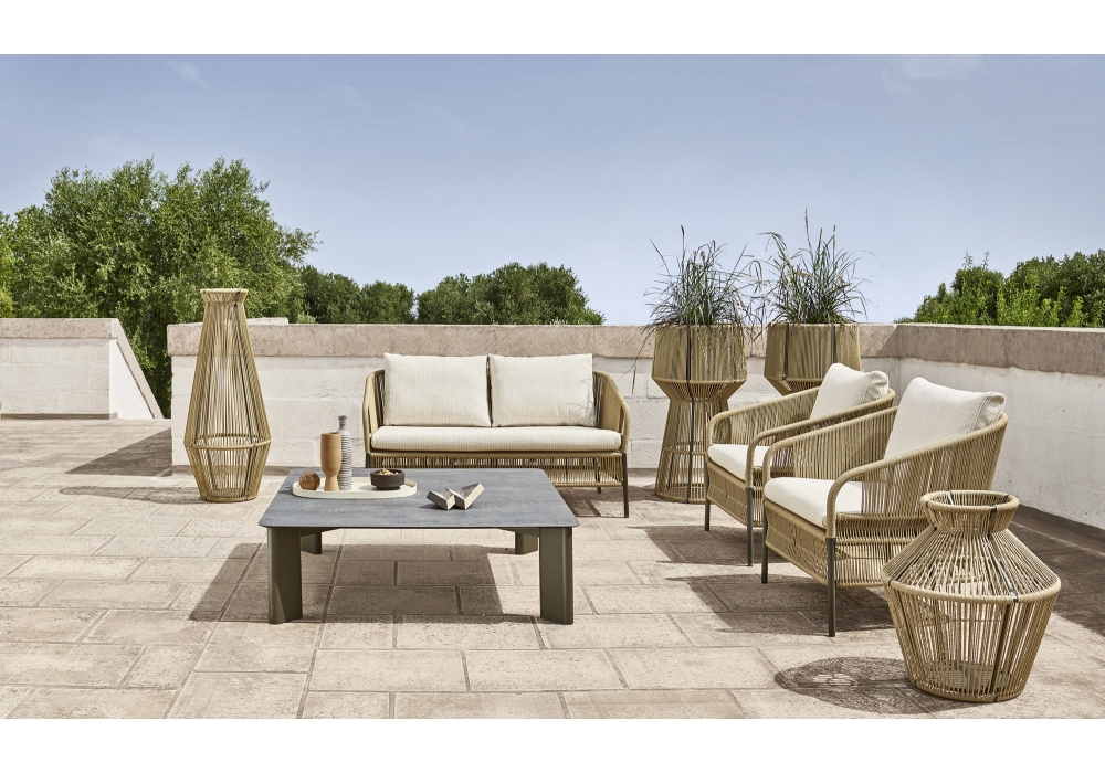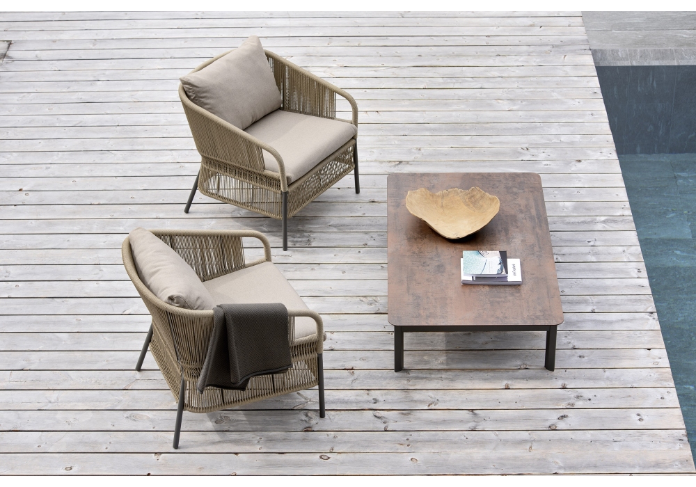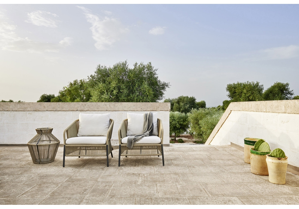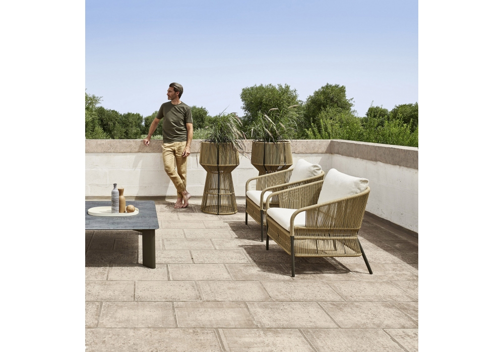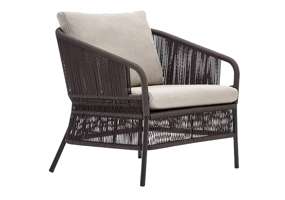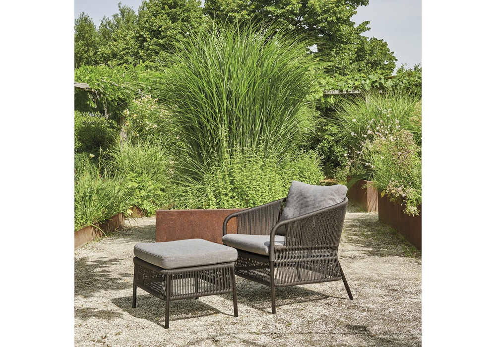 Cricket conçu par Anki Gneib pour Varaschin est un fauteuil tissé à la main en fibre synthétique avec structure en aluminium enduit de poudre. Coussin avec rembourrage en caoutchouc. Disponible en différentes finitions.