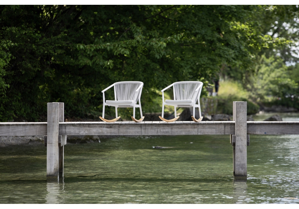 Smart conçu par R&D pour Varaschin est un fauteuil à bascule avec structure en aluminium enduit de poudre, assise en tissu technique, dossiers tissés en corde synthétique. Disponible en différentes finitions. Luges en bois massif d'Iroko.