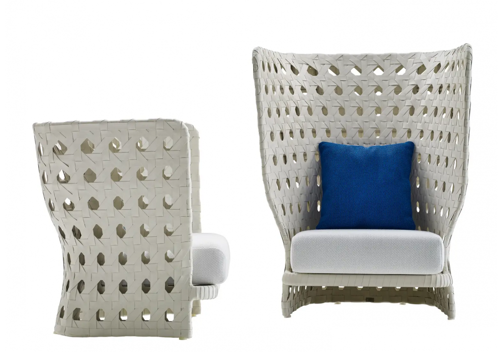 Canasta conçu par Patricia Urquiola pour B&B Italia Outdoor, est un fauteuil à dossier haut avec structure en aluminium peint en blanc et tissage en fibre de polyéthylène blanc. Revêtement de l'assise en différents tissus.