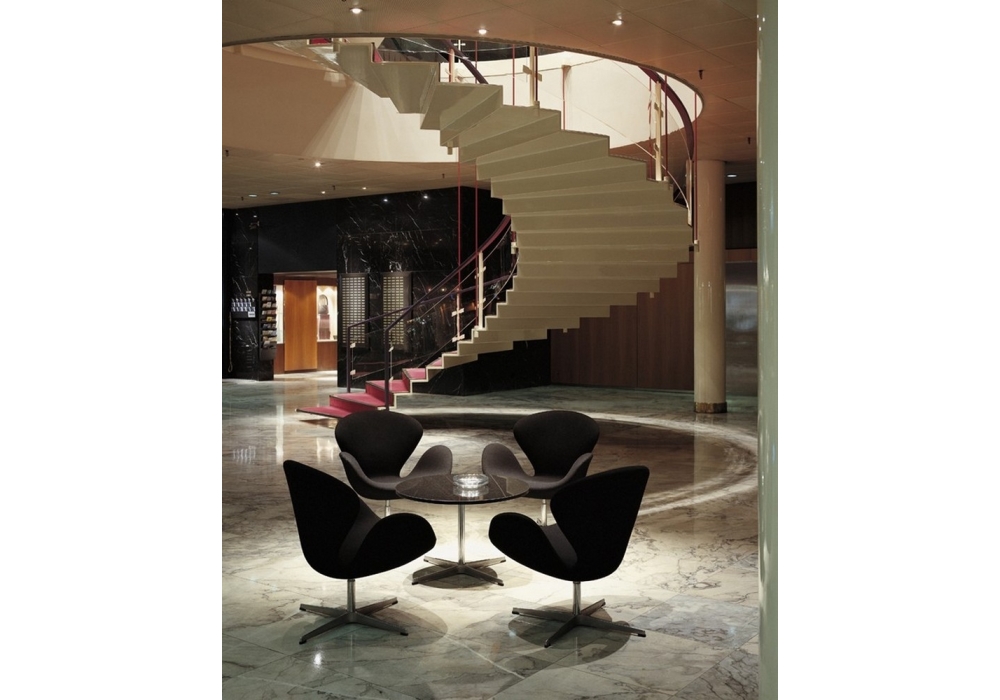 Swan conçu par Arne Jacobsen pour Fritz Hansen est un fauteuil pivotant avec revêtement en tissu ou cuir et base à 4 branches en aluminium poli ou thermolaqué. Disponible en différentes finitions.