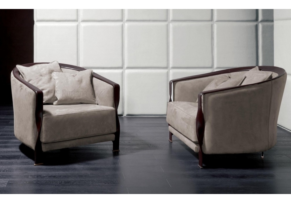Paris conçu par Rugiano est un fauteuil disponible avec revêtement en tissu ou en cuir. Détails en laiton bronzé. Version avec dossier lisse ou matelassé.