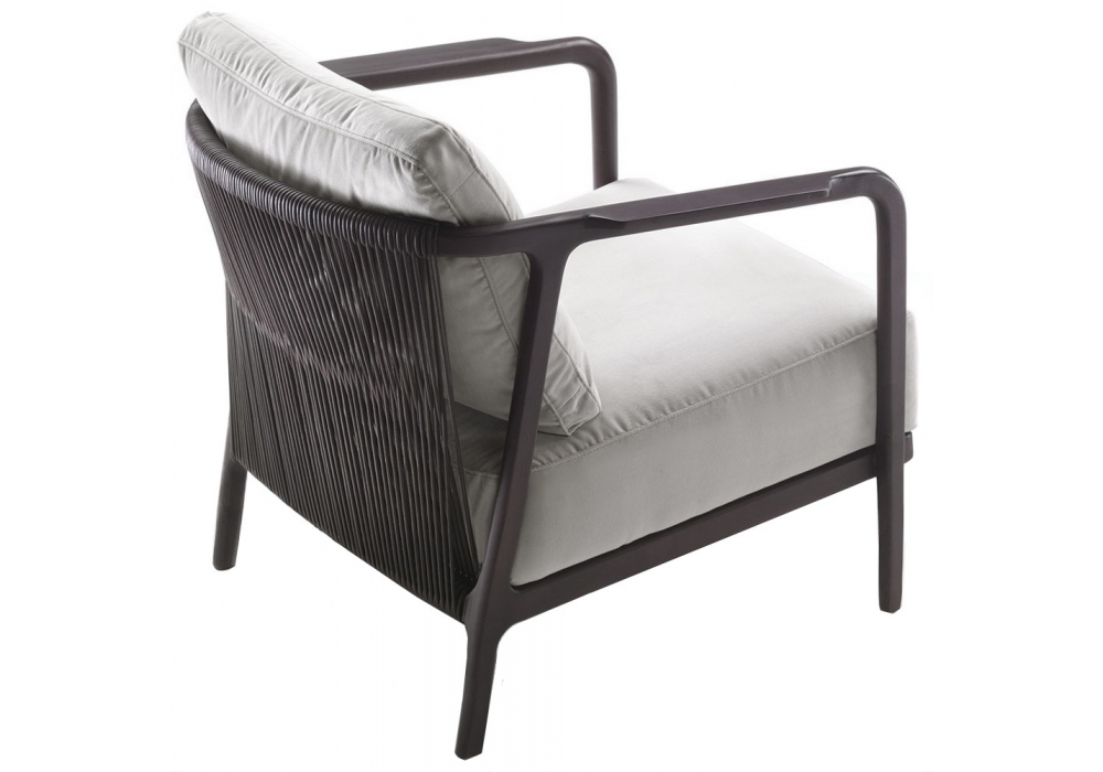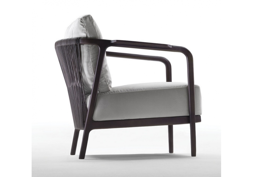 Crono conçu par Antonio Citterio pour Flexform est un fauteuil réalisé en bois massif, assise en cordon de cuir tressé, en bois et métal avec polyuréthane expansé, rembourrage recouvert de tissu de protection couplé, coussin de dossier en plume, revêtement amovible en tissu ou cuir.
