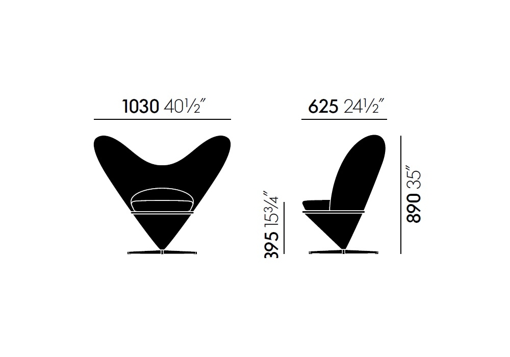 Vitra Heart Cone chair chaise: Verner Panton, 1959. Version conçue un an après la création du Cone Chair et qui en raison de sa forme de cœur fut baptisée Heart Cone Chair. Si les deux « ailerons » en saillie du Heart Cone Chair peuvent rappeler les oreilles de Mickey, ils peuvent également être interprétés comme une adaptation contemporaine de la bergère à oreilles classique.