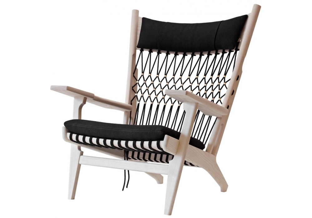 PP129 Web Chair designed by Hans J. Wegner for PP Møbler is an easy chair with flag halyard in nature or black. The clips connecting the flag halyard come in stainless steel, brass or black. Seat and neck cushions come in fabric or leather, and the cover for the neck cushion comes in a range of fabrics specifically suited for carrying the cushion.