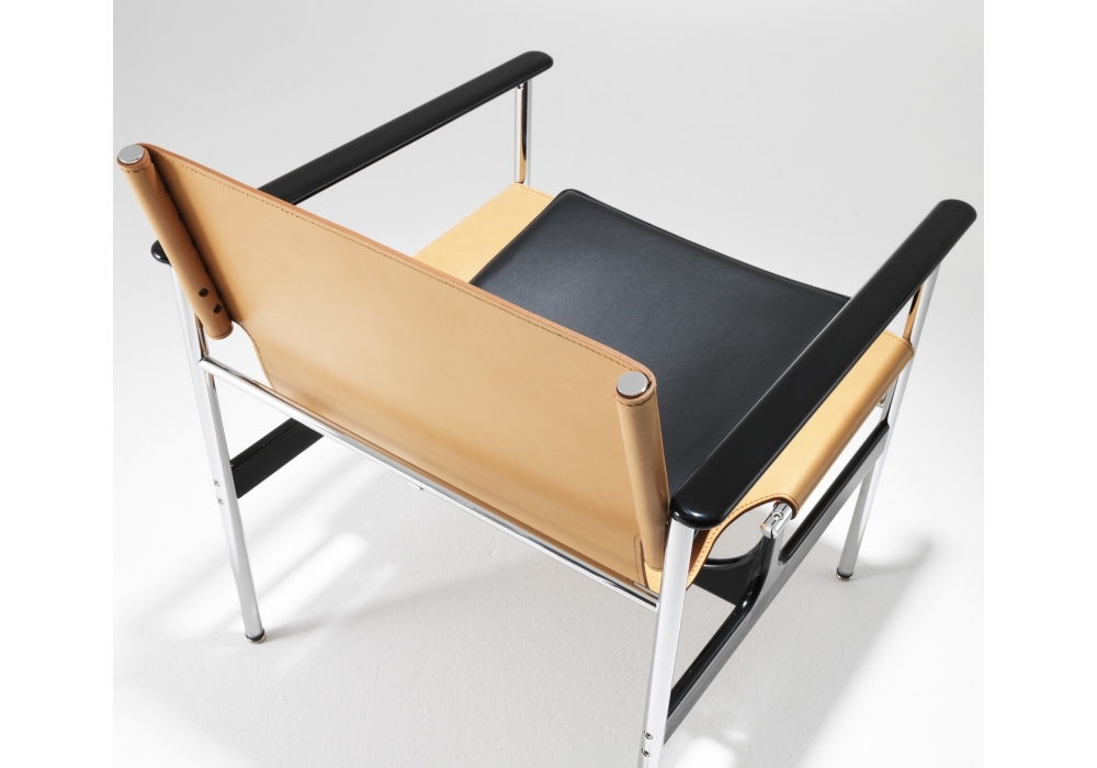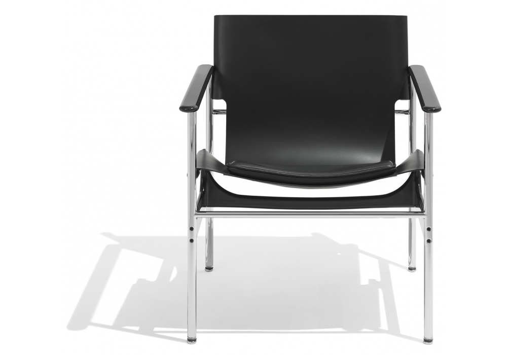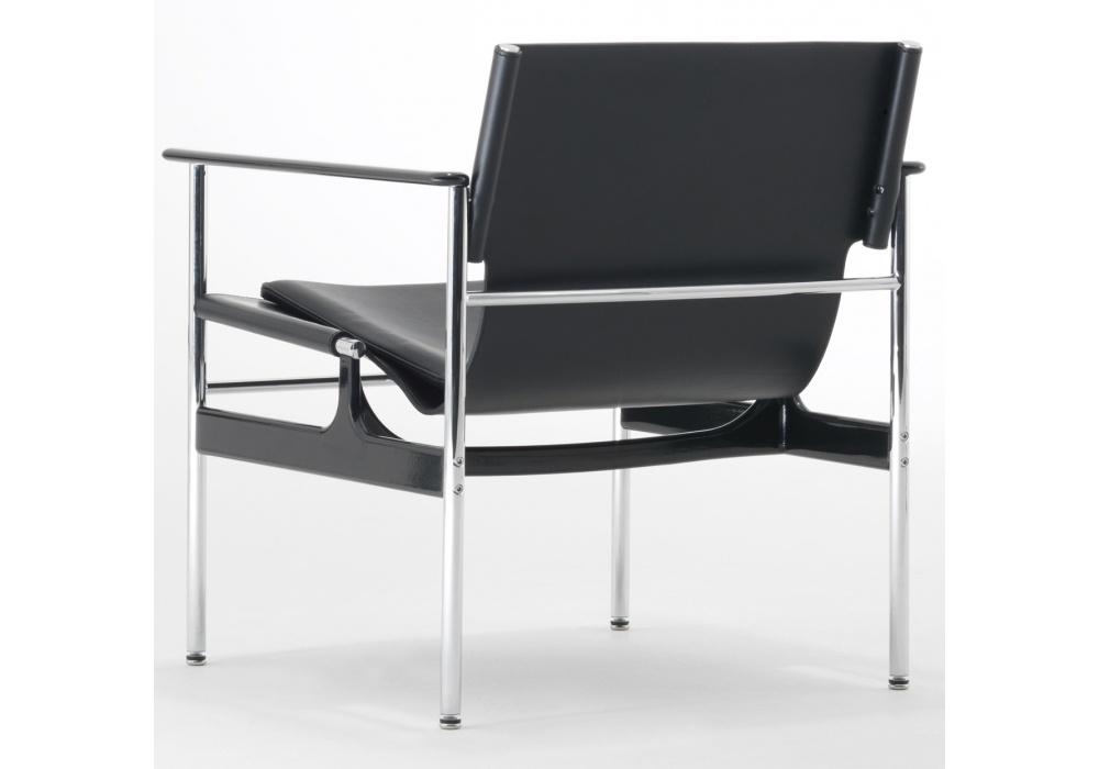 Fauteuil Pollock conçu par Charles Pollock pour Knoll avec structure en tube d'acier chromé, accoudoirs et cadre en aluminium peint en noir. Pieds en acier. Sangles recouvertes de cuir en trois couleurs différentes. Coussin en caoutchouc polyuréthane recouvert de cuir.
