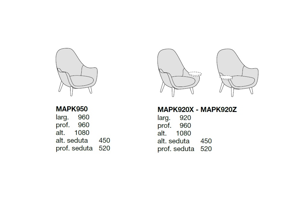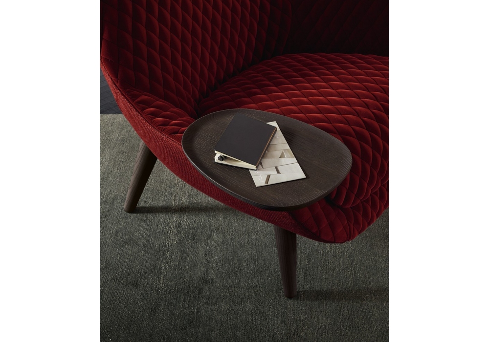 Mad King conçu par Marcel Wanders pour Poliform est un fauteuil avec pieds en bois, assise en polyuréthane flexible moulé monocoque et revêtement en tissu ou cuir. Version avec un accoudoir disponible avec plateau en option.