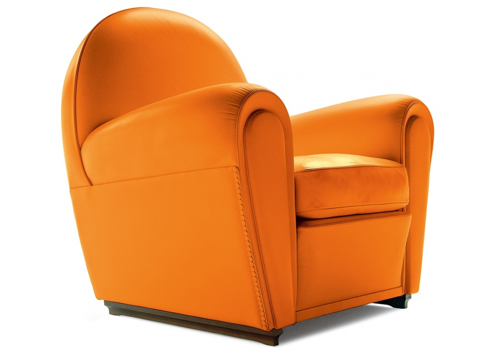 Vanity Fair, conçu par Renzo Frau pour Poltrona Frau, est un fauteuil dont la structure porteuse est en hêtre massif séché, avec des ressorts biconiques en acier noués à la main et attachés à des ceintures de jute. Supports en hêtre teinté noyer foncé. Coussin d'assise en duvet d'oie. Revêtement en cuir ou tissu Pelle Frau®. Disponible avec pouf.