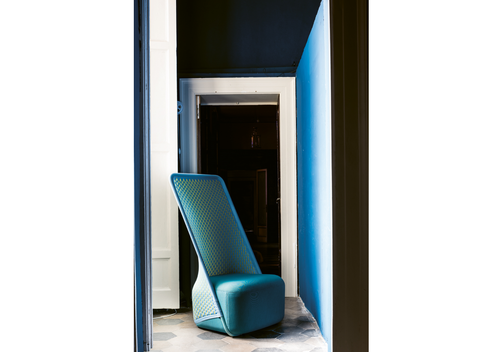 Cradle conçu par Benjamin Hubert pour Moroso est un fauteuil avec coque en acier verni. Assise en tissu d'ameublement.